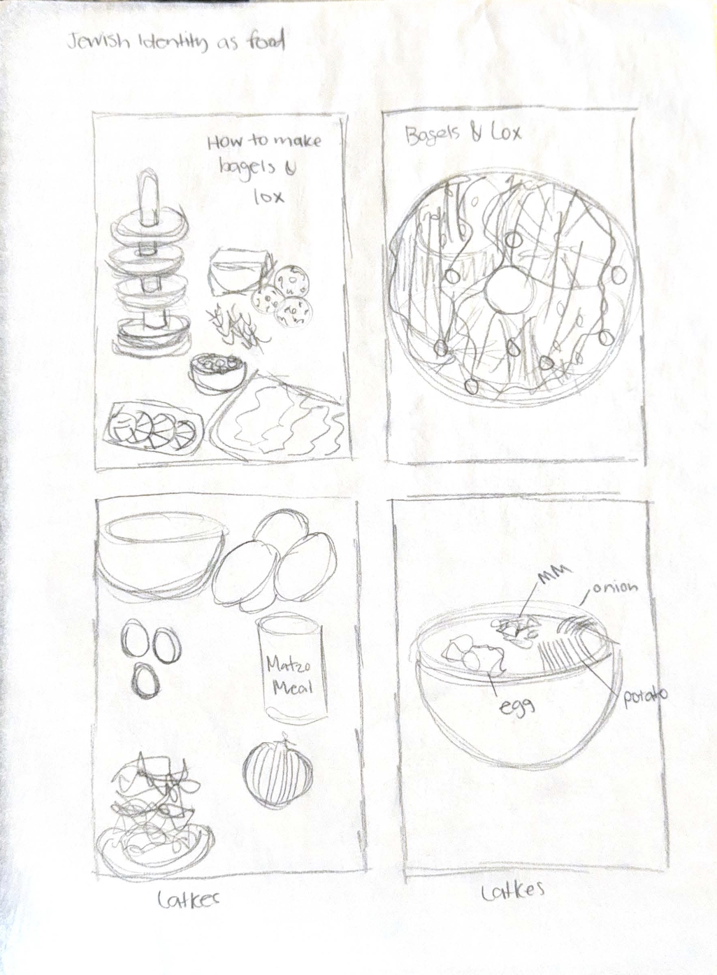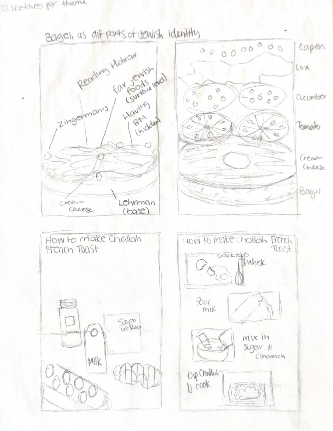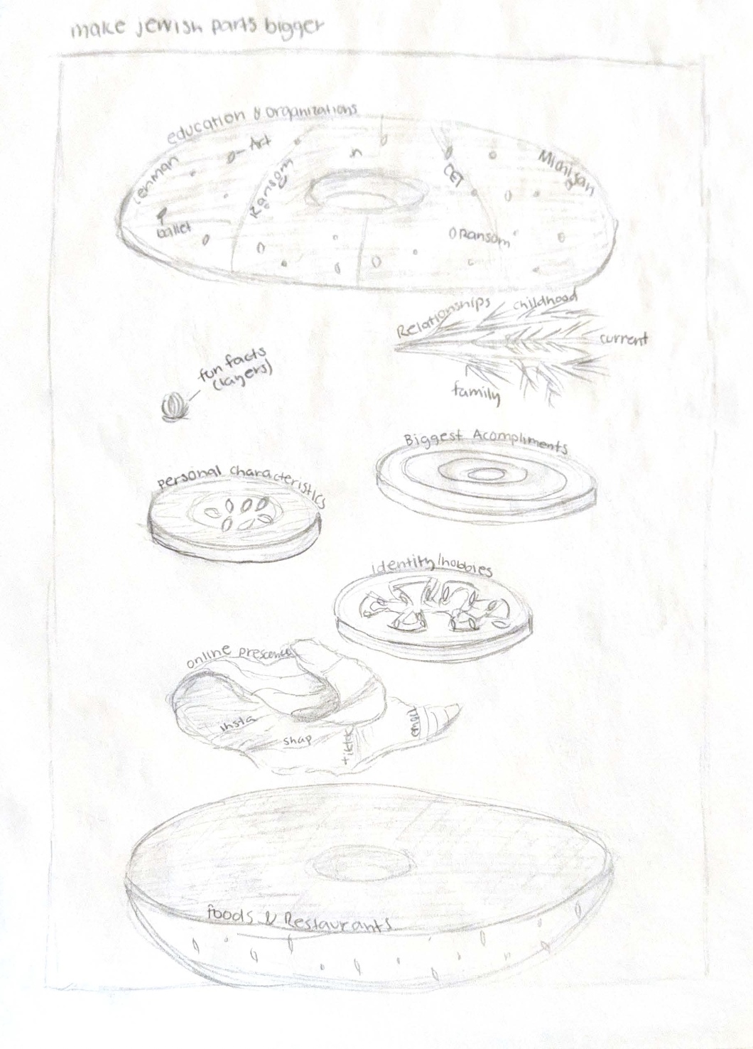 The bagel acts as the central organizing framework, with layered components categorizing aspects of my life including education, cultural background, relationships, accomplishments, personality traits, and favorite foods. I used typographic hierarchy and visual coding to signal importance, bolding elements that most strongly connect to my Jewish identity, which serves as a foundational layer within the system.